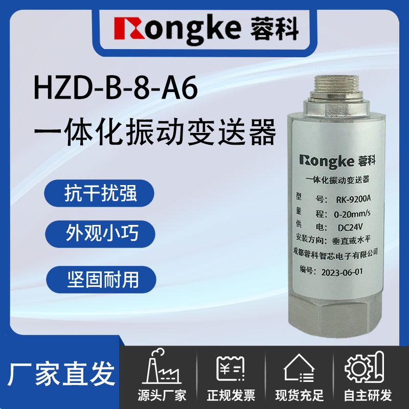 一体化振动变送器HZD-B-8-A6:将磁电式振动传感器、精密测量电路集成在一起,构成高精度振动测量系统,该变送器可直接连接DCS、PLC或其它设备,是测量风机、电动机、水泵等工厂设备振动的理想选择。